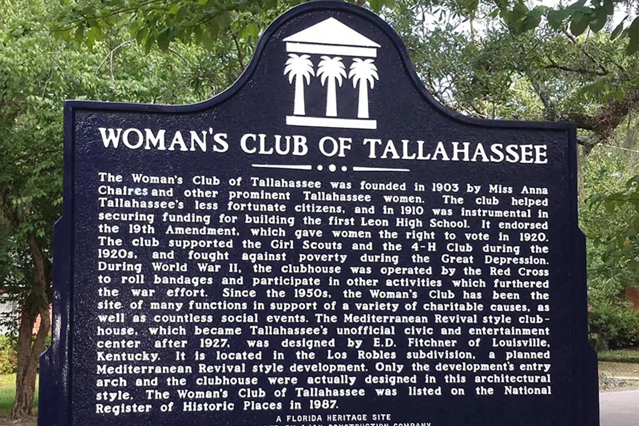 Nestled among the oak trees at the entrance to Los Robles is a stately structure – the Clubhouse for the GFWC Woman’s Club of Tallahassee. Since its completion in 1927, this historical landmark has been the site of countless civic, social, educational and entertainment events.